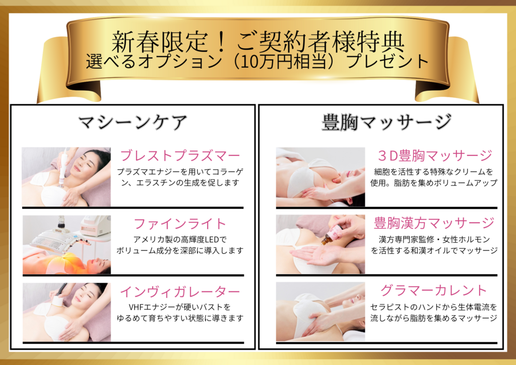 上記技術の中からお好きなバストアップチケットを10万円分プレゼント致します。